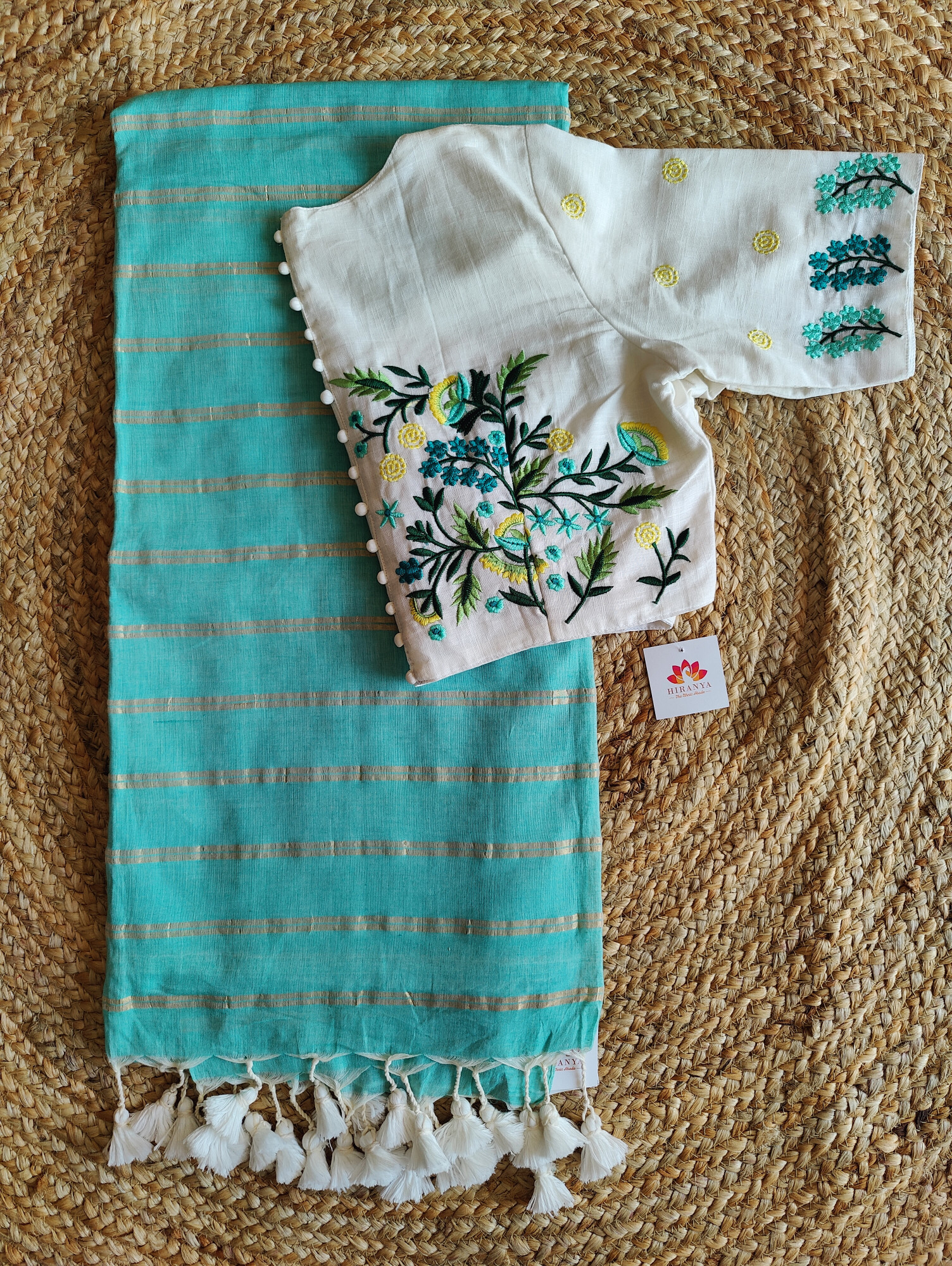 Aqua Blue zari stripes cotton saree with matching blouse