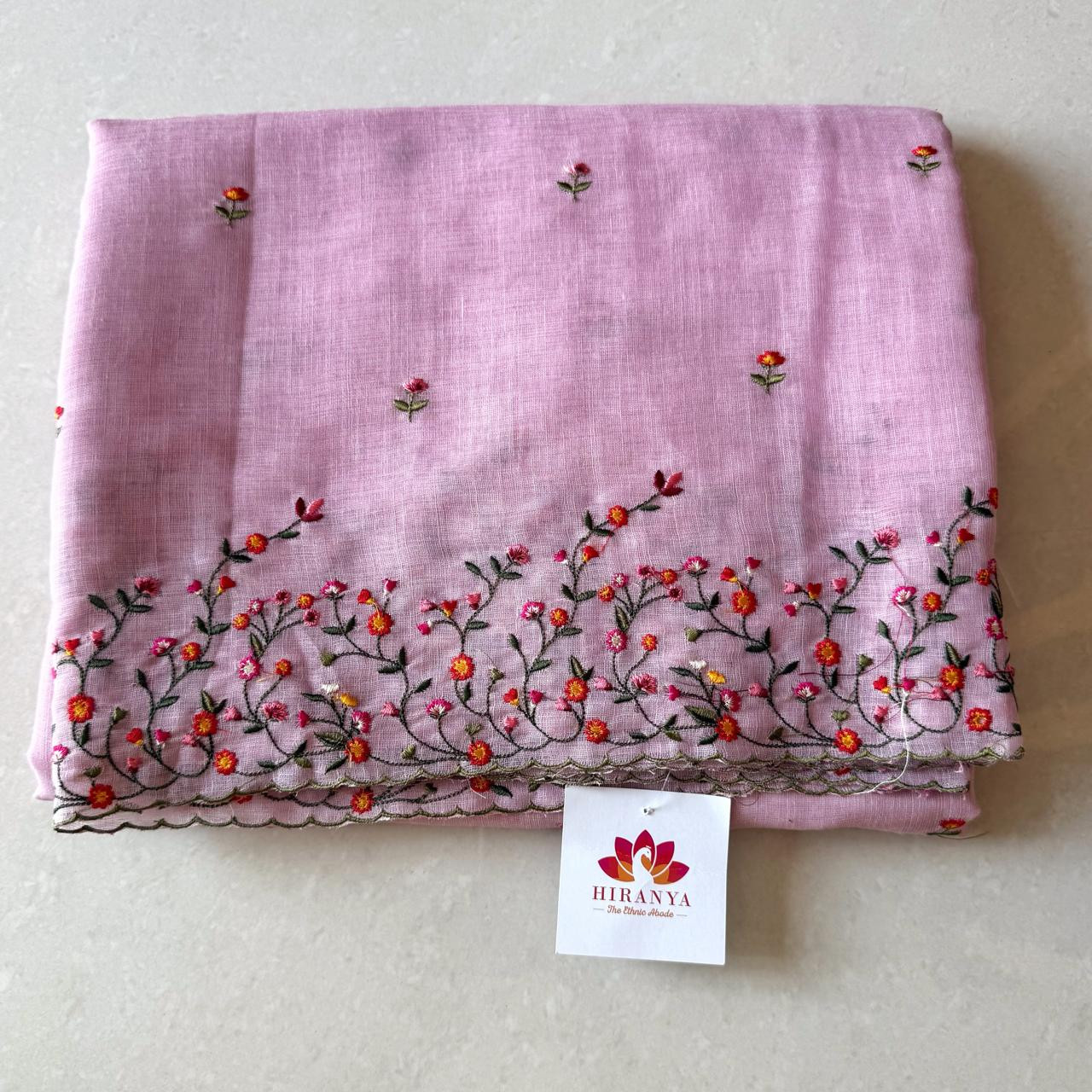 Linen Cotton Floral Embroidery and scalloping Saree- Baby Pink