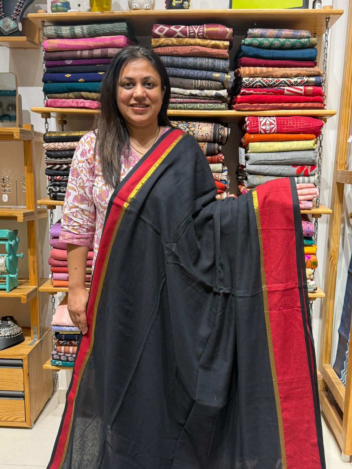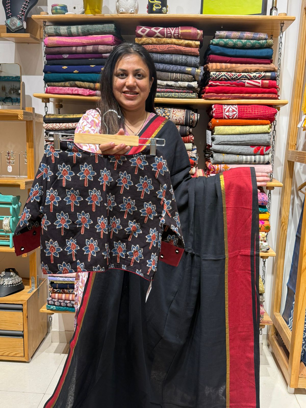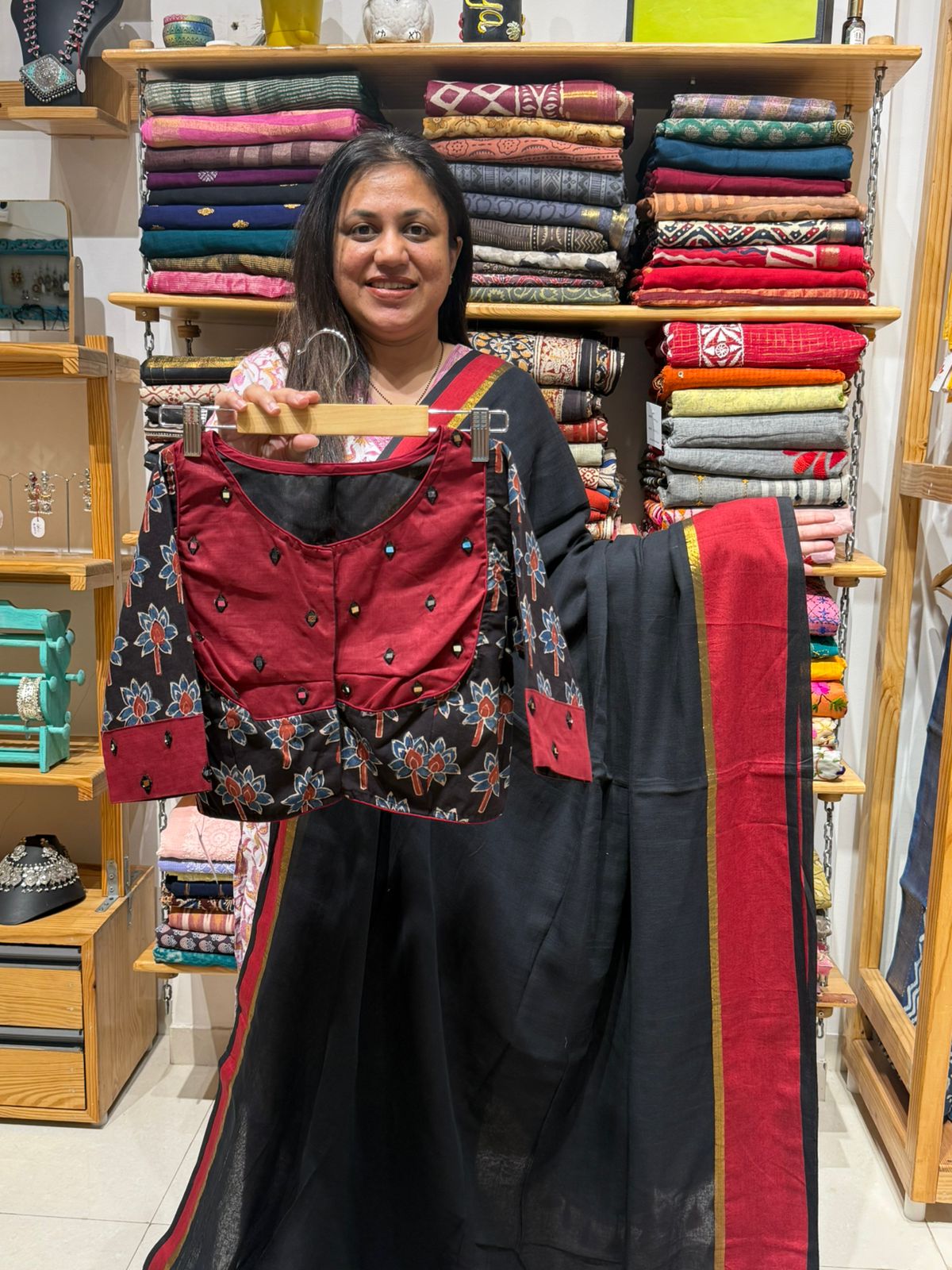 Black Mul Cotton Saree with Ajrakh patchwork non Padded Blouse