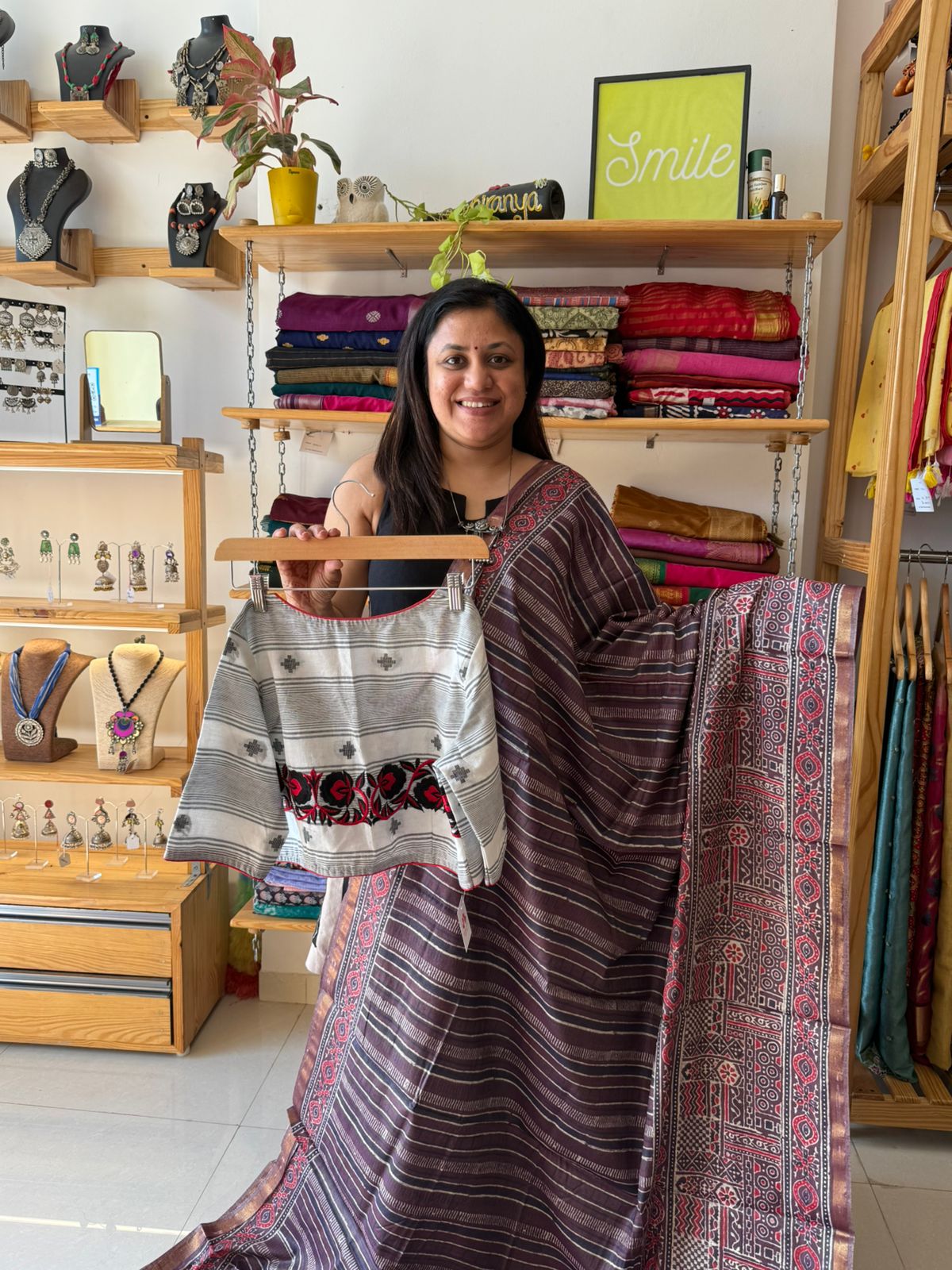 Coco cola Colour Handblockprint saree with White Embroidered Blouse