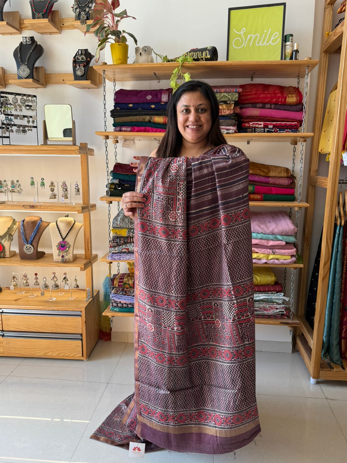 Modal Screen Print Saree - Ajrakh Pallu - Red