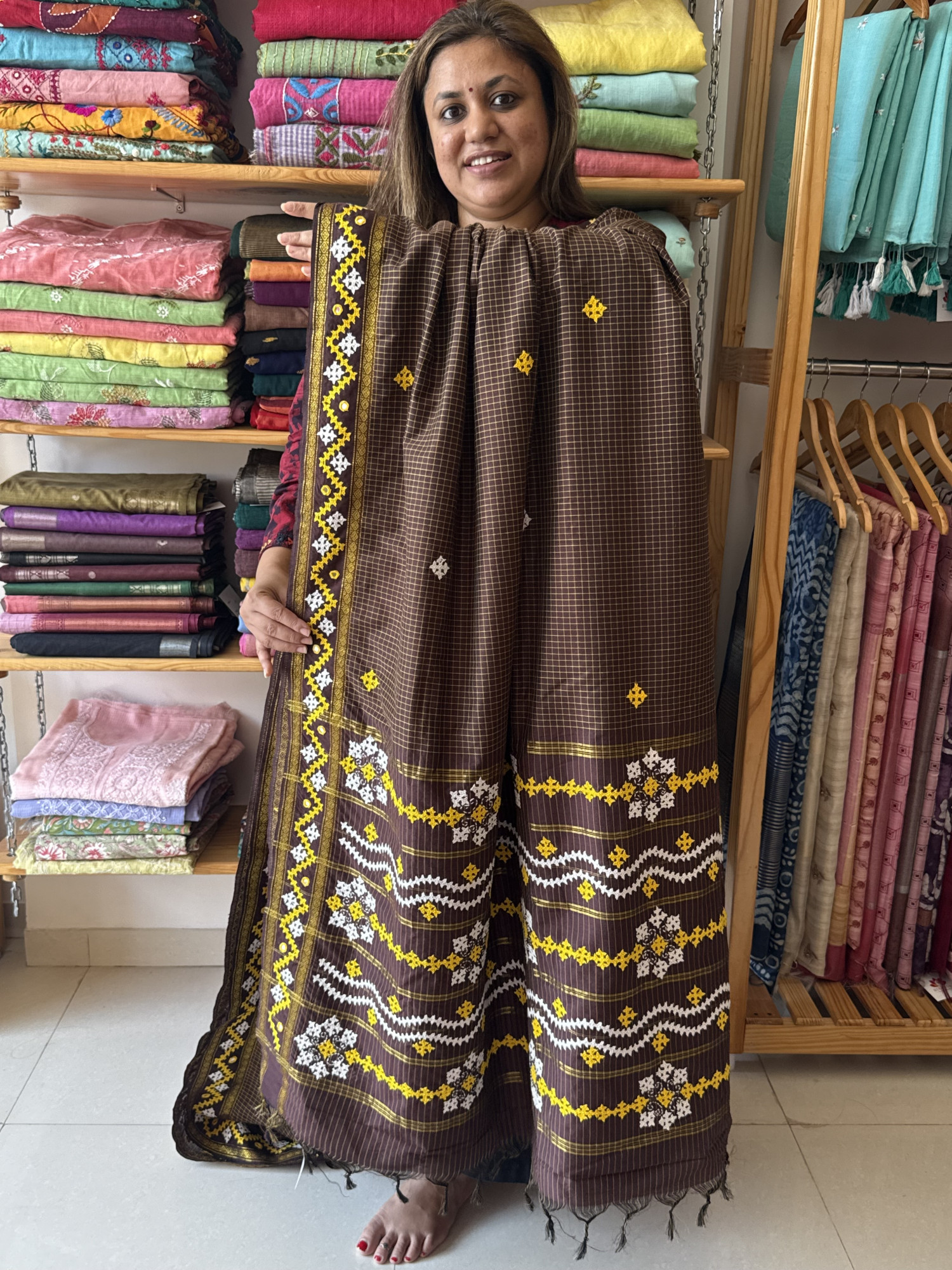Gadhwal Saree with Gujarati Handwork - Brown