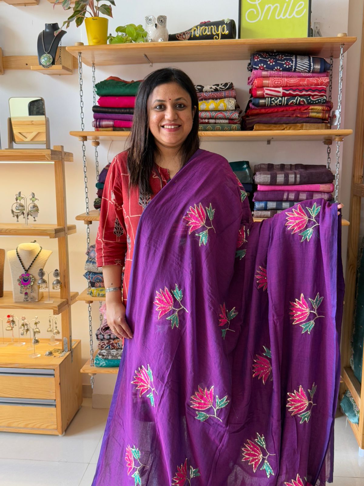 Lotus Embroidery and Sequence Work MUL SAREE Purple