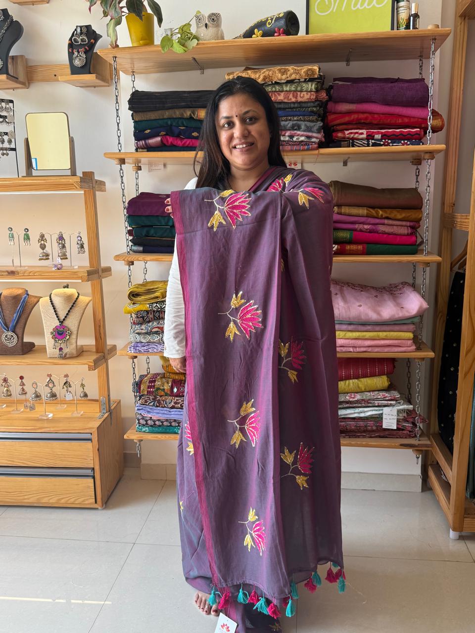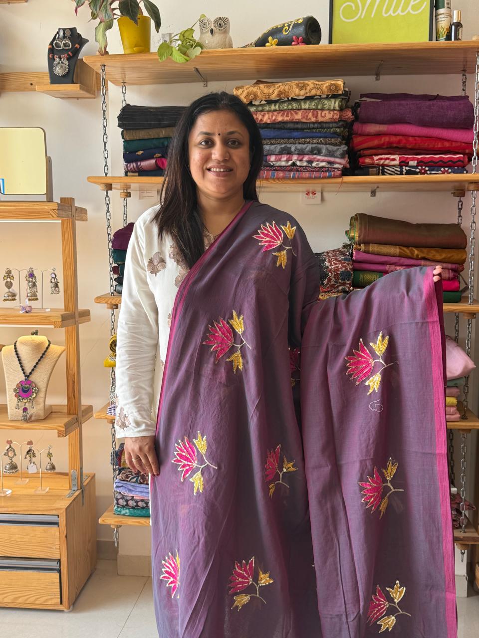 Lotus Embroidery and Sequence Work MUL SAREE -Violet