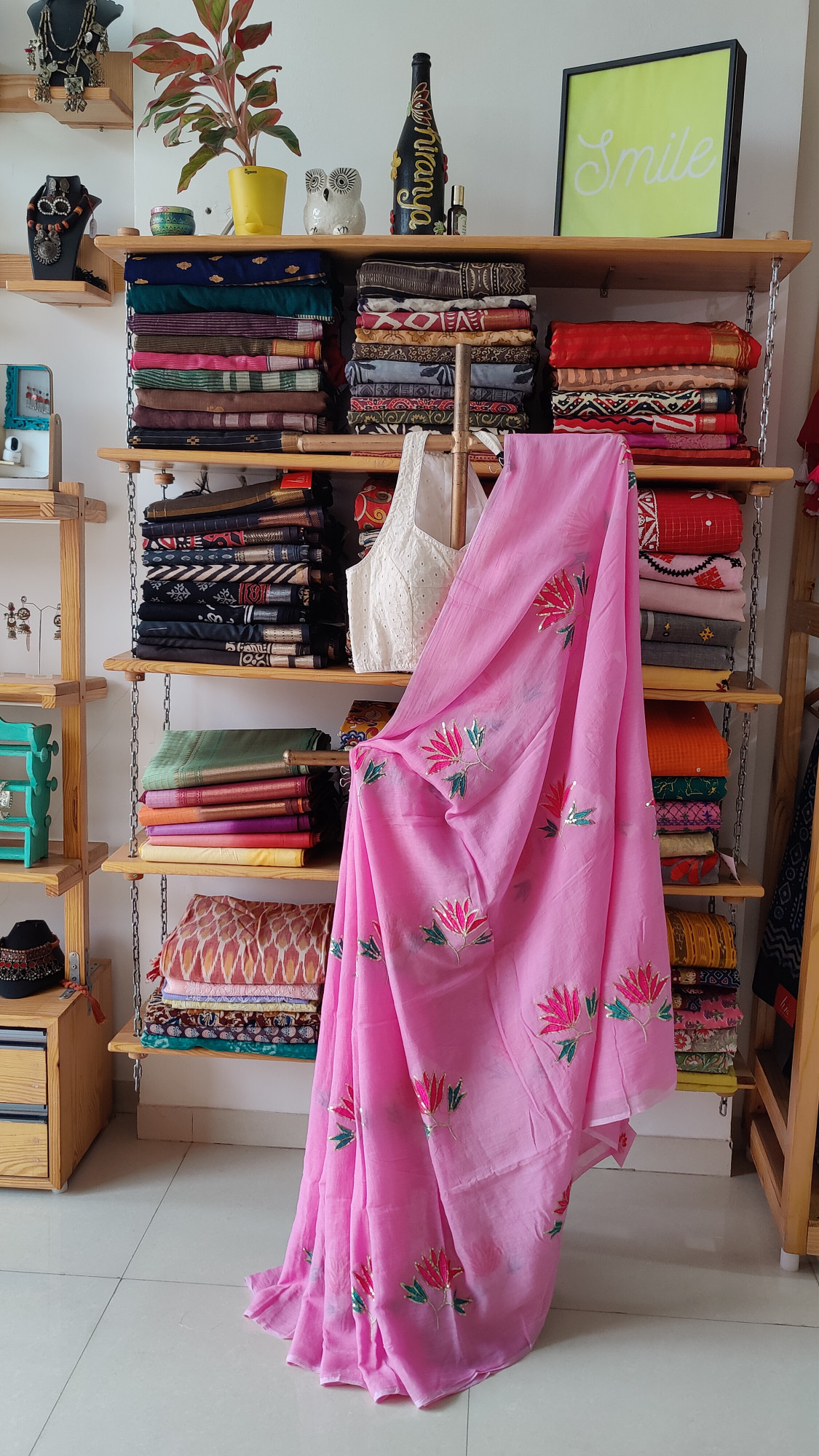 Lotus Embroidery and Sequence Work MUL SAREE - Pink