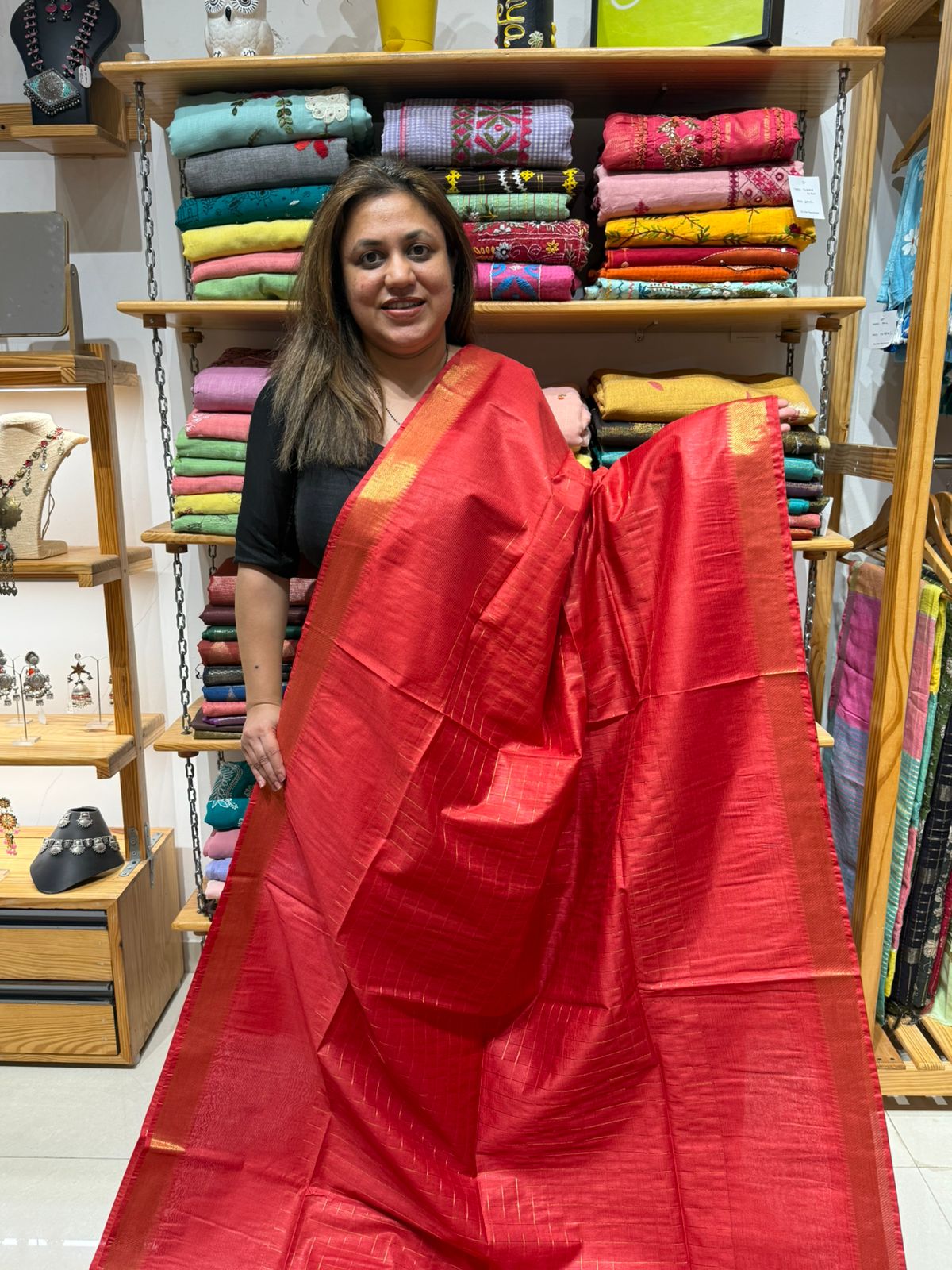 Mercerized Cotton Needle Jamdani Weaving Saree -RED