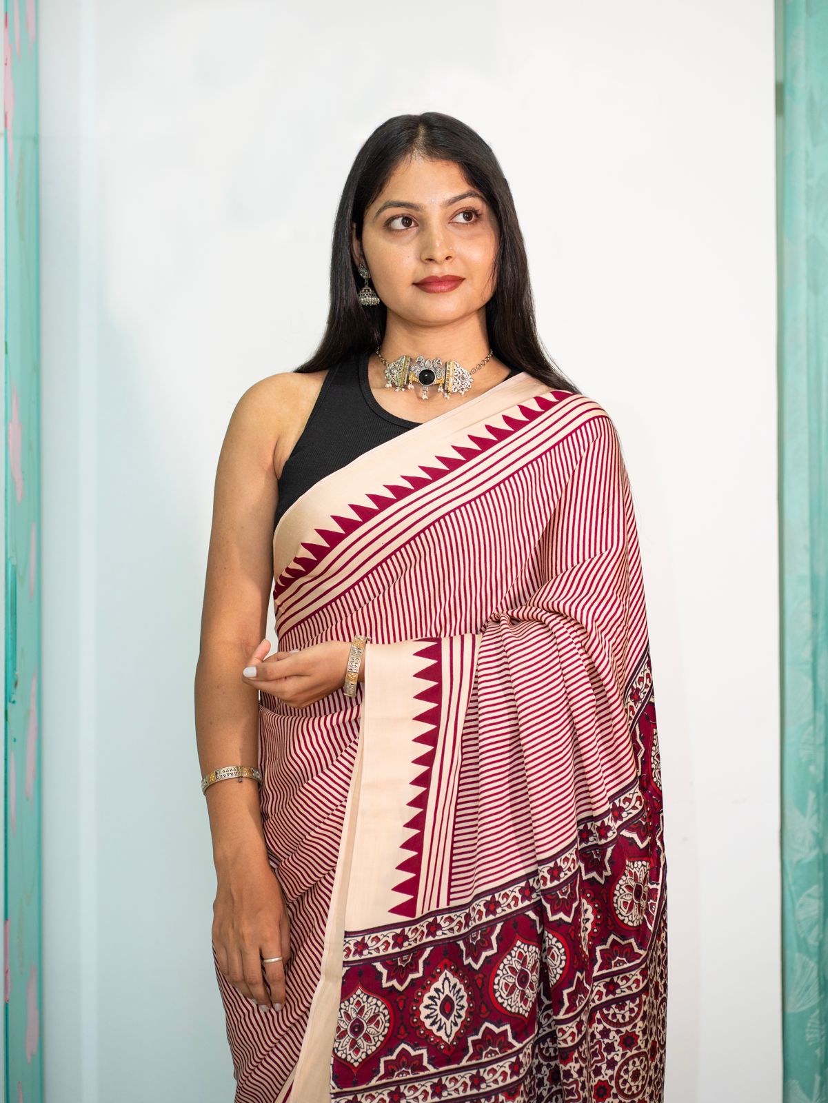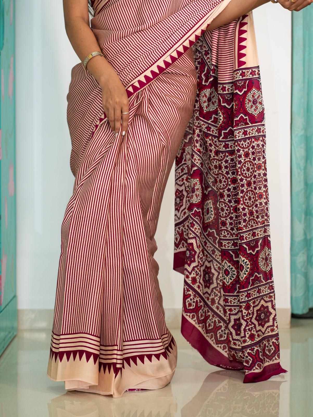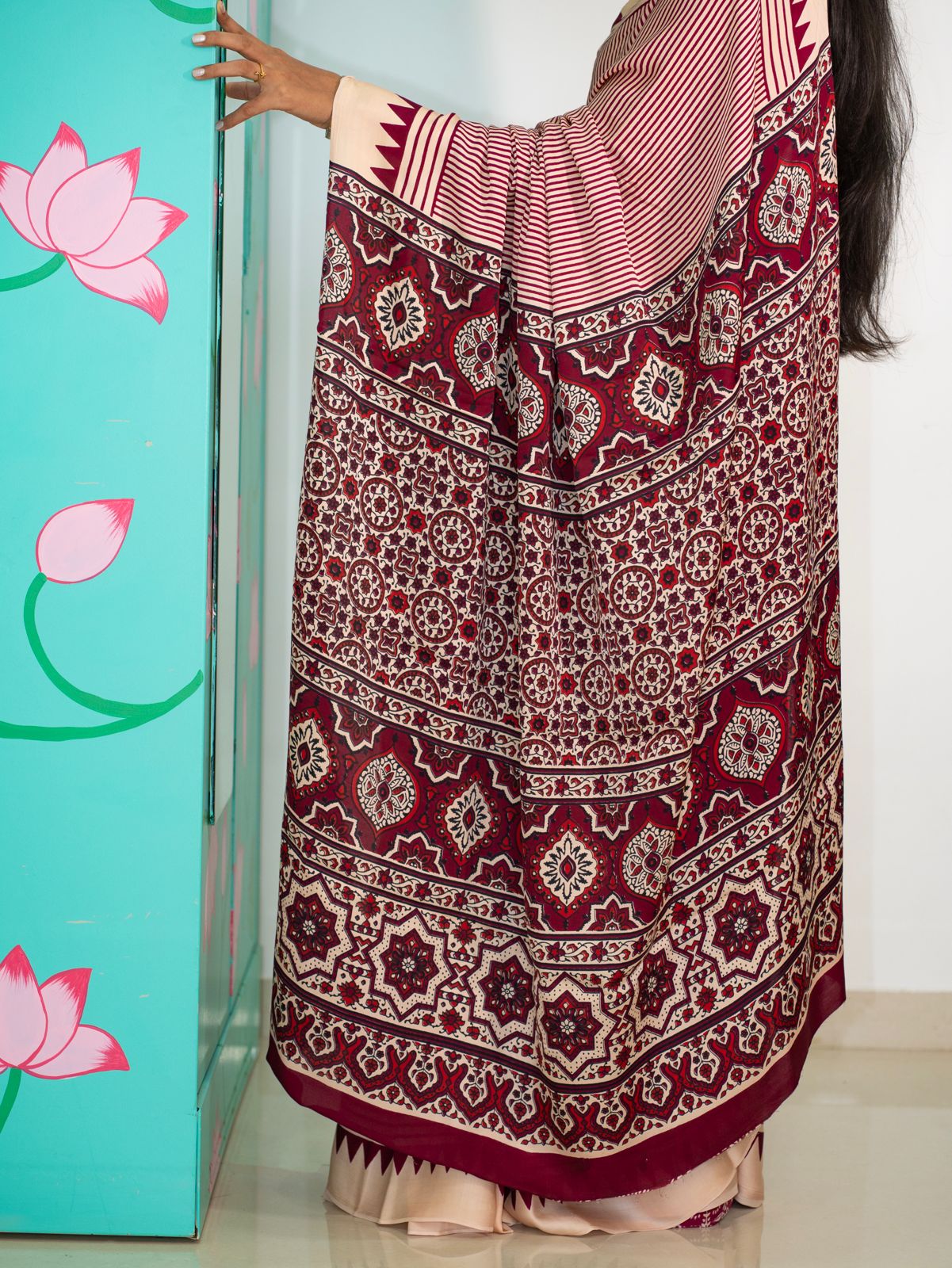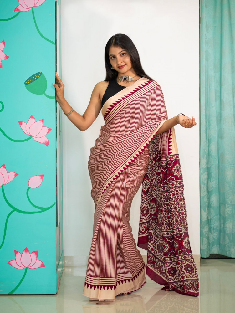 Modal Screen Print Saree - Ajrakh Pallu - Red