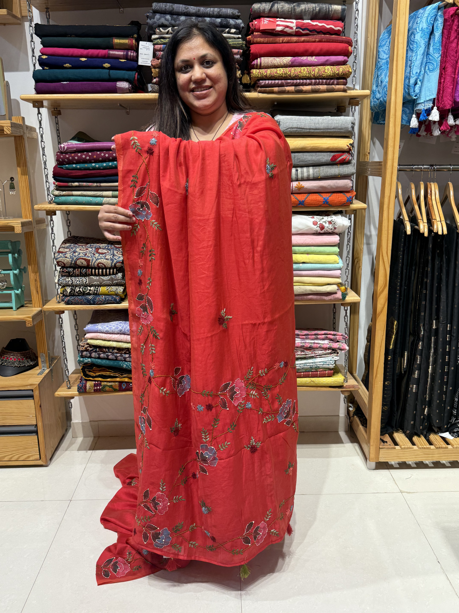 Mul chanderi Handpaint and Handwork Saree - Red