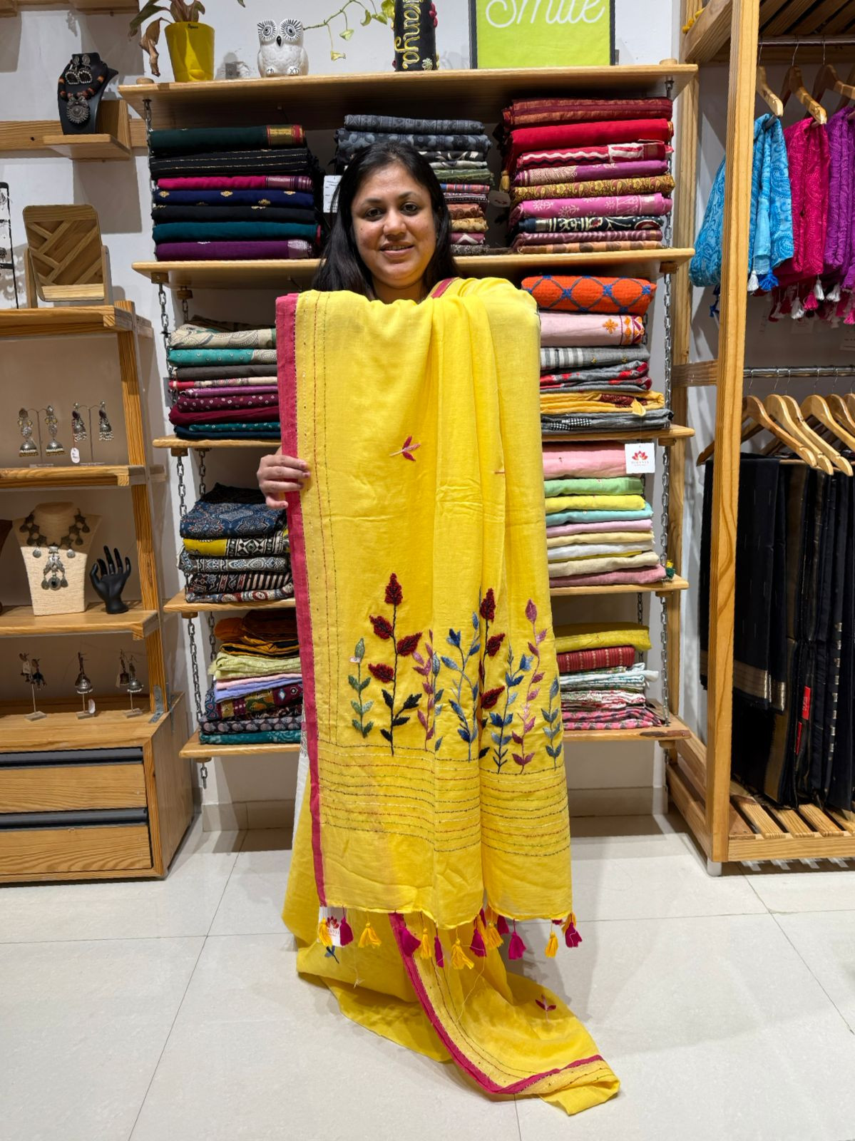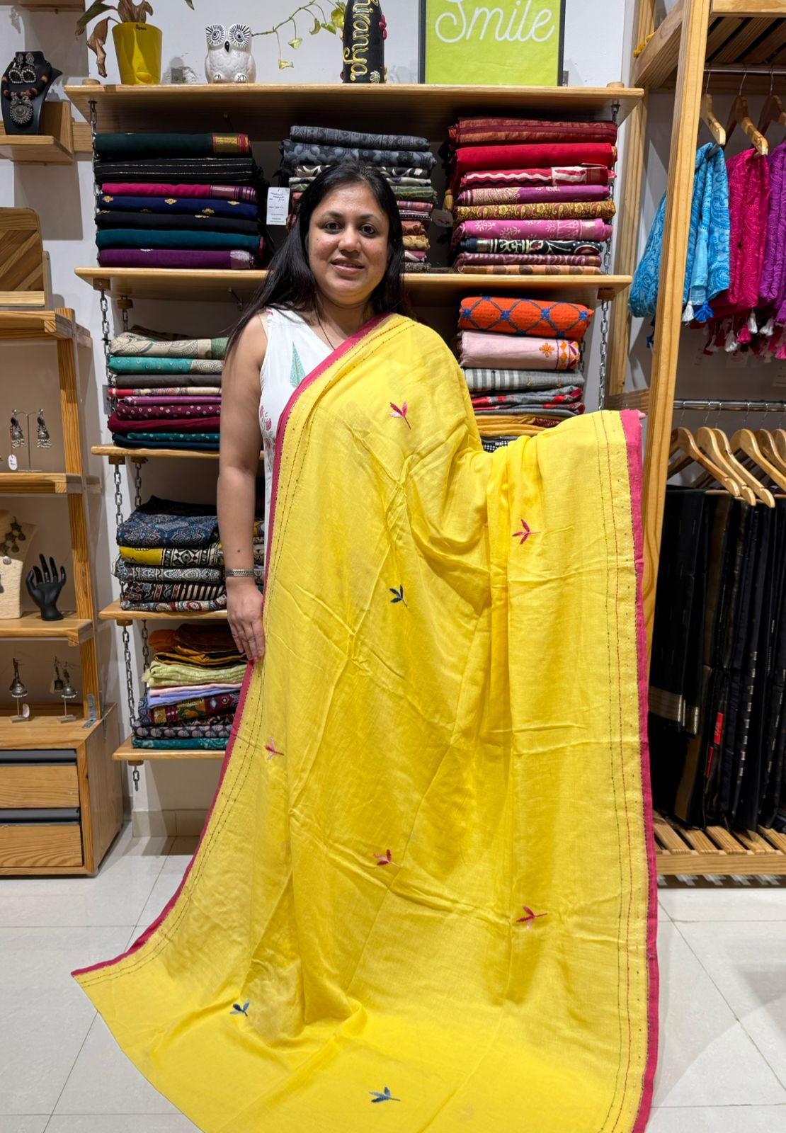 Mul Saree with Hand Embroidery - Sunshine Yellow